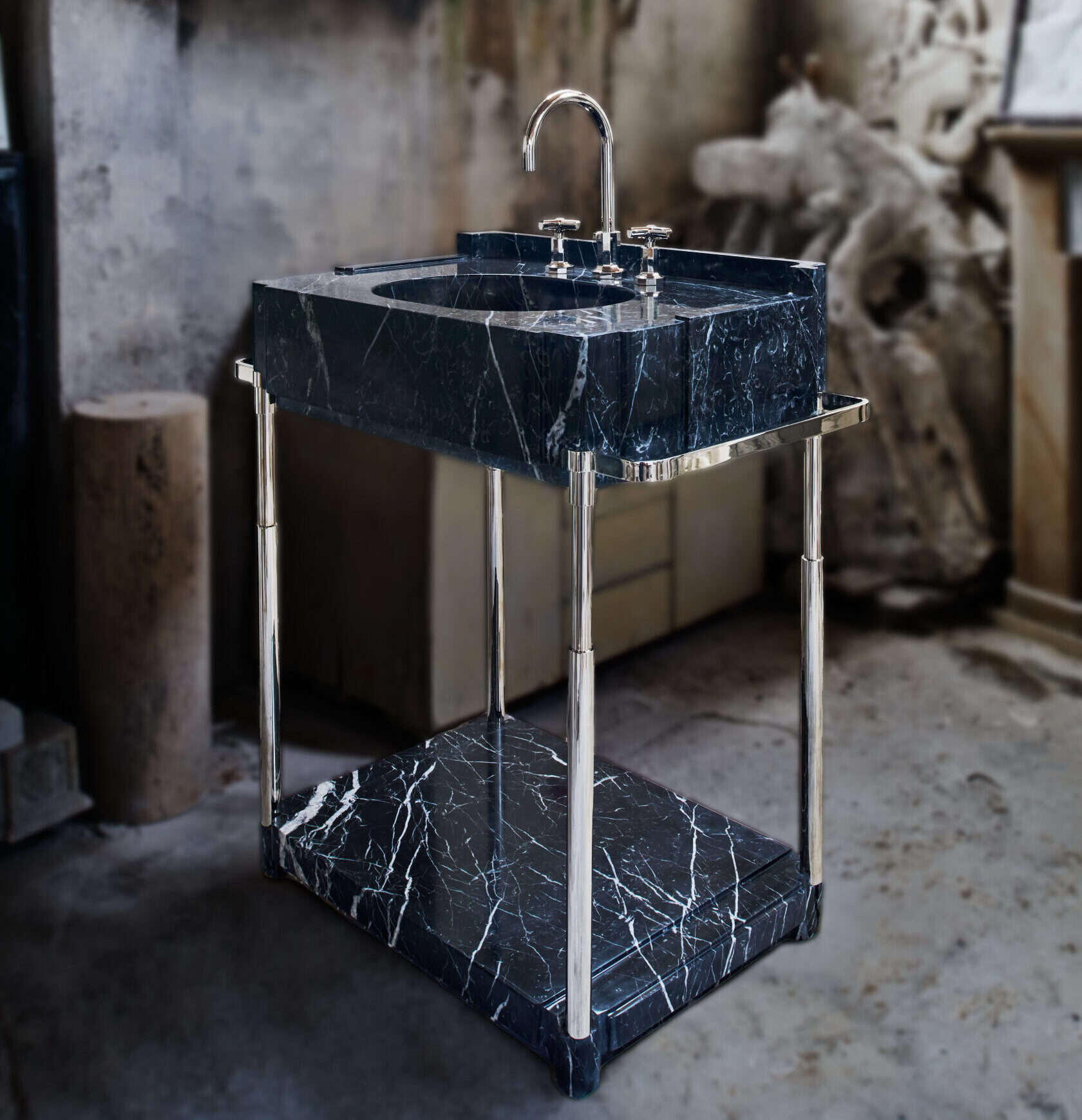 In the compact Hamilton Washstand, telescopic metal legs give an effortless lift to the basin which has rounded and recessed corners softening its rectilinear shape—all details nodding to Art Deco architecture.