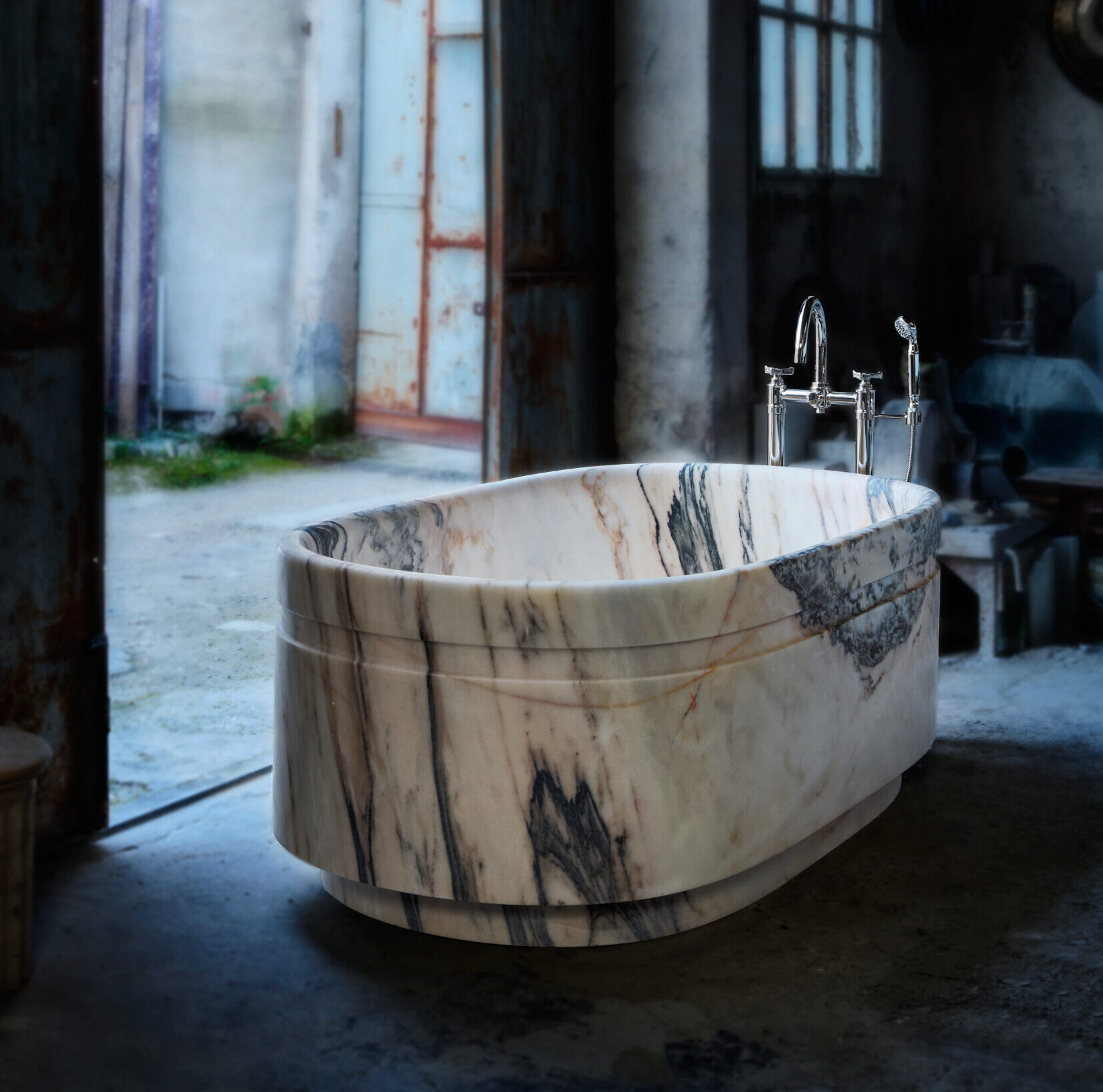 The Hamilton Tub is a thoughtful marriage of form and function. The reveal below the rim provides an elegant grip, a recessed base makes it easy to step in, and its honed interior is ergonomically sculpted for comfort.