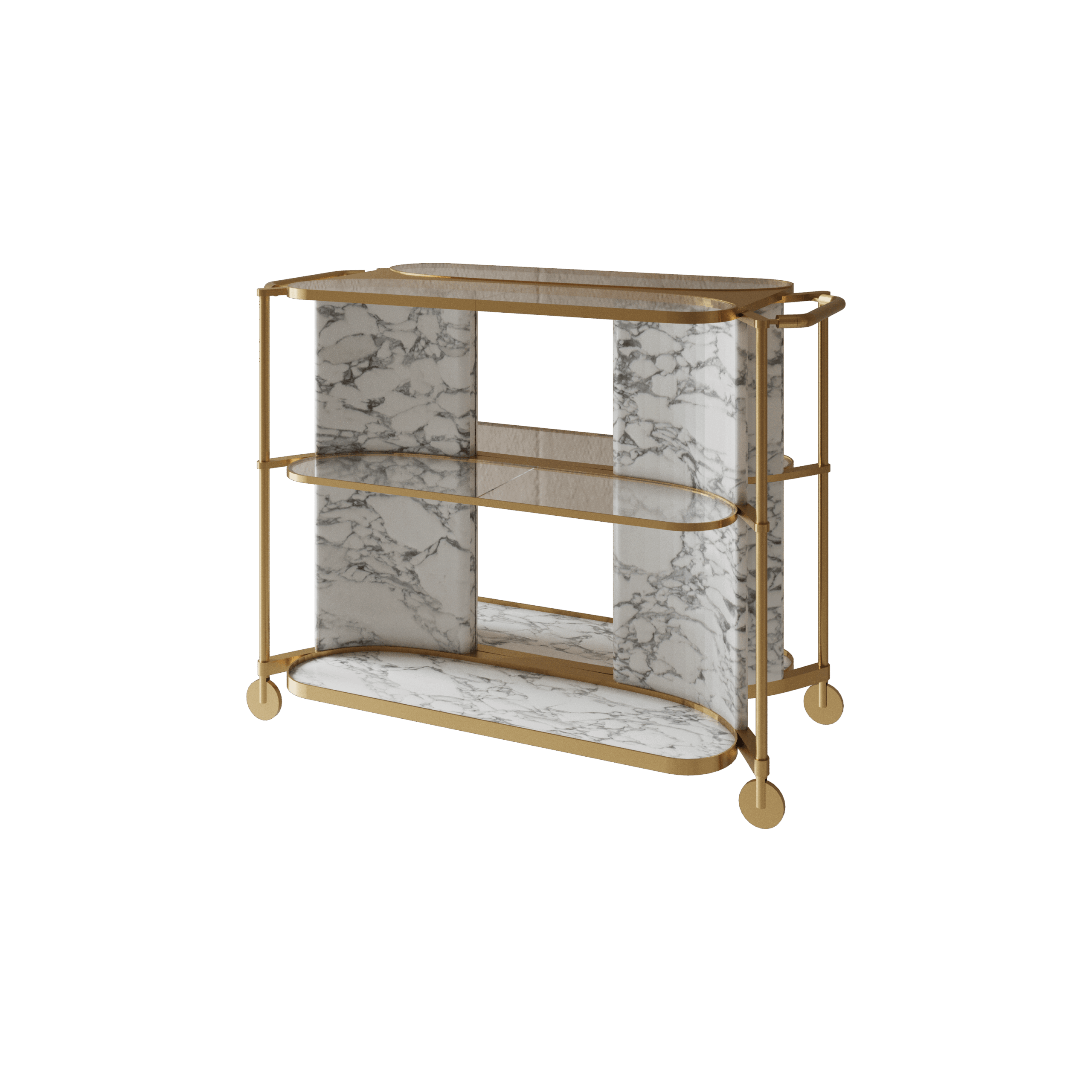 The Savoy Serving Cart is an object of dynamic elegance and utility, designed to glide through any space with an air of sophisticated grace. A harmonious blend of stone, metal, and glass creates its luminous silhouette. It moves effortlessly, transforming service into a performance in any corner of the room.