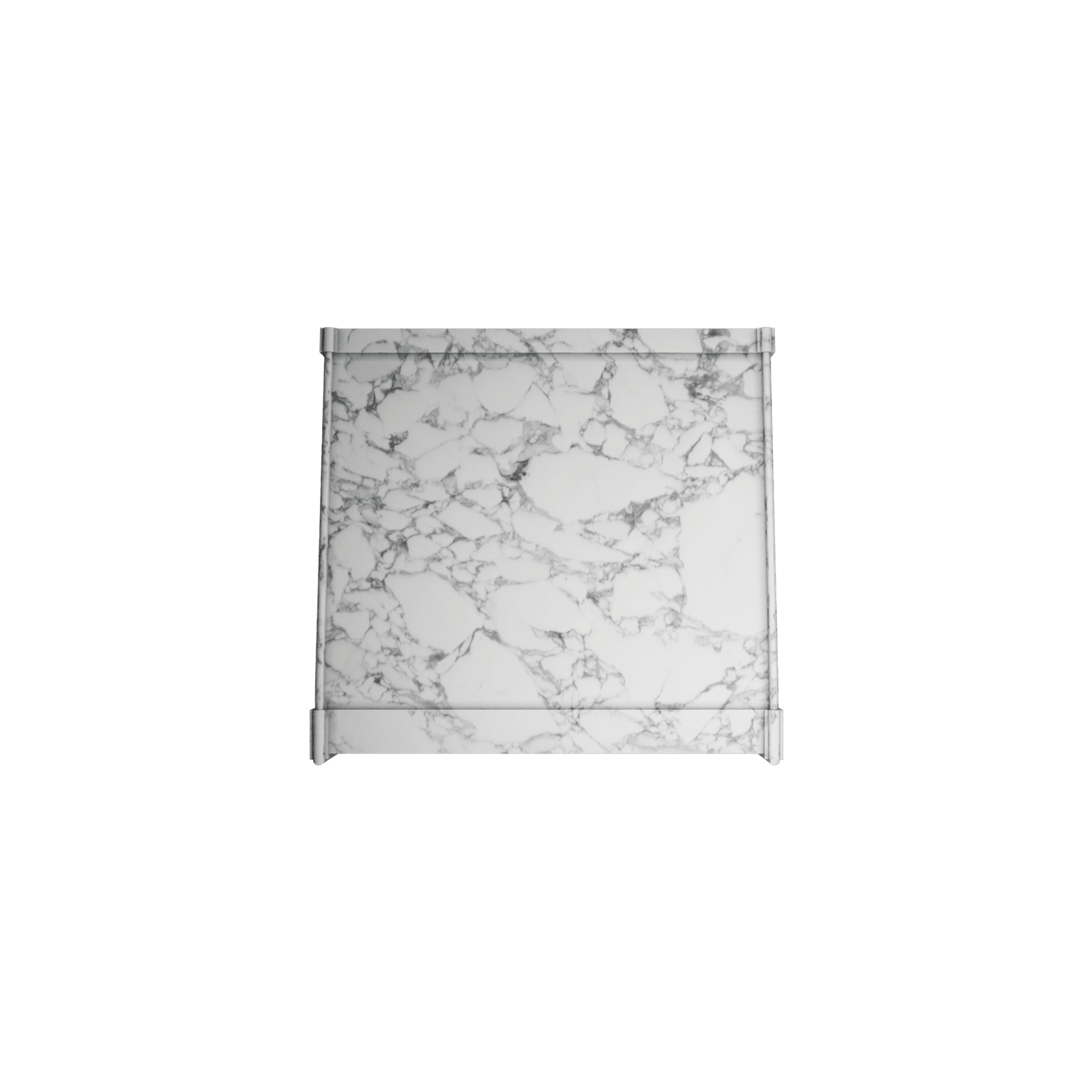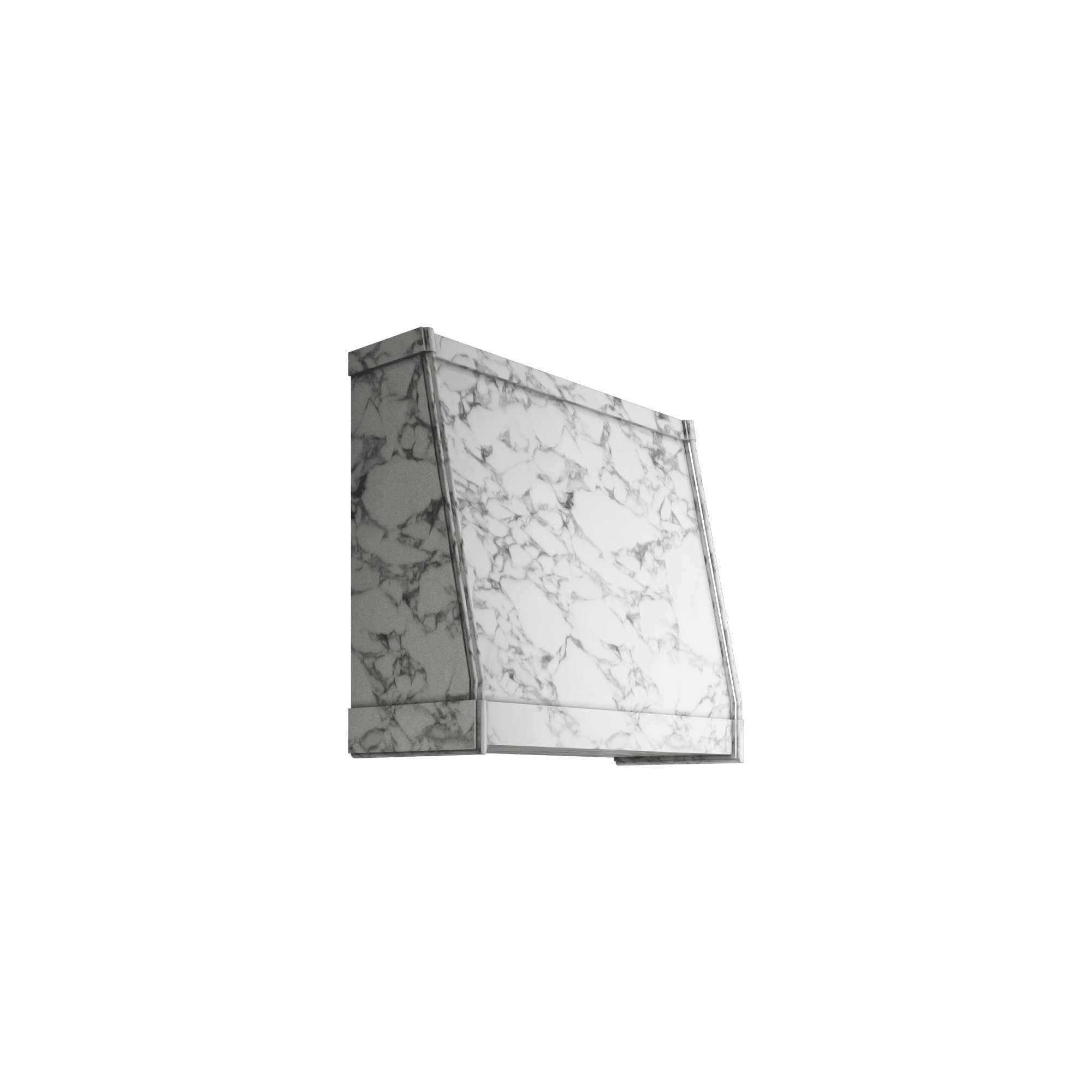 Carved from a single block, the Hamilton Hood balances heft and elegance with carved corners, gleaming metal accents and studied shadow lines that add nuance to its planes of dynamic natural stone. Straight sides allow for a clean transition between the hood and cabinets.