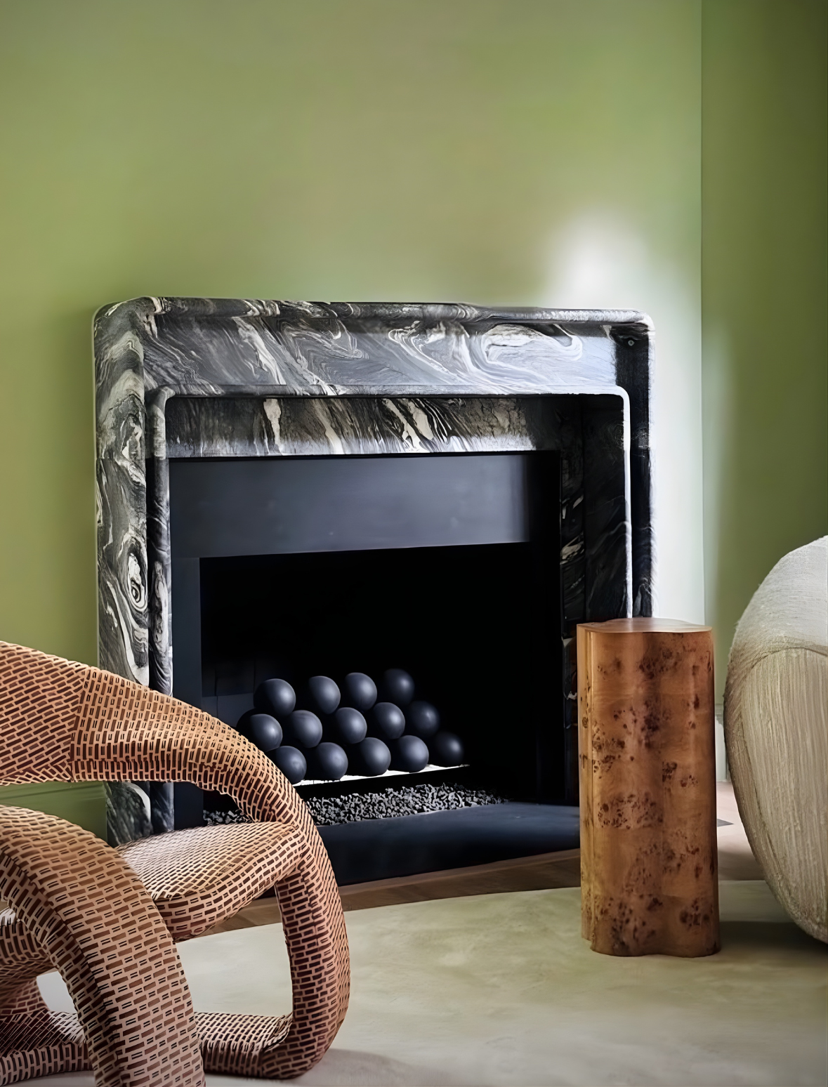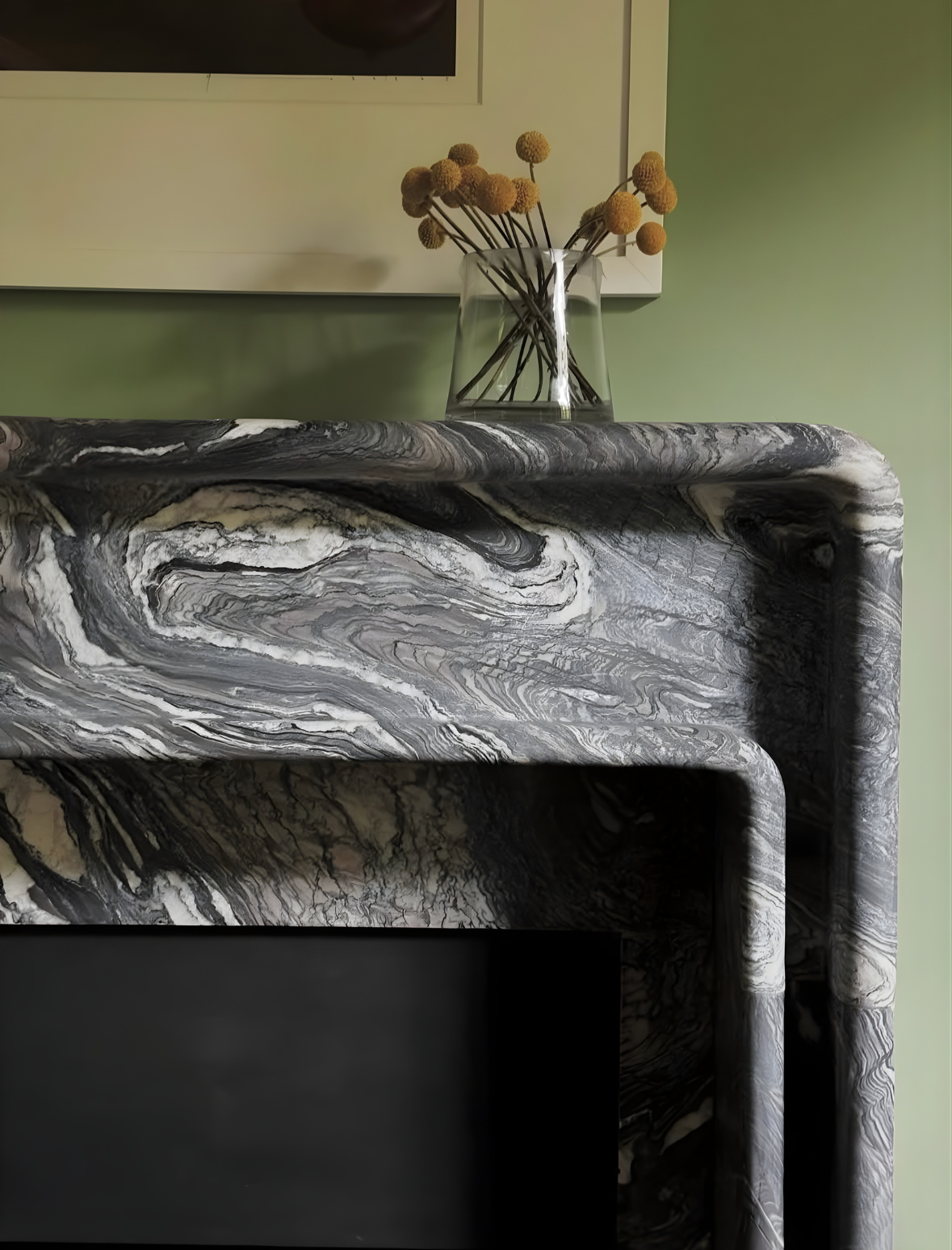 The Tassilo’s defining bullnose profile feels refreshingly contemporary, creating a flowing curve of stone highlighting the poetry of carving from natural stone block. Compact and elegant, it brings chic sophistication to smaller spaces—like a finely engineered car, every line is purposeful and refined. The inner bullnose frames the fire as a glowing centerpiece. With options for a metal inlay and alternate stone for the upper mantel, this piece can be minimal or maximal – fashioned to complement any room.